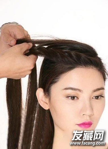 从开始的那一束头发开始编织的过程中,不断从剩下的U形区中加头发进去编织,以续发的形式进行编织可以更好地固定发辫的走向。