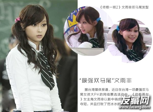 据台湾媒体报道,近日在台湾一项最强双马尾女孩大PK的网络票选活动中,《终极恶女》女主角文雨非以剧中俏皮活泼的双马尾发型夺冠,并且打败了范冰冰的双马尾造型。