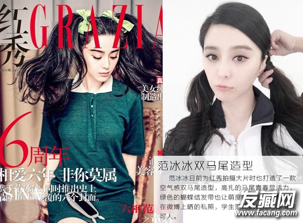 范冰冰日前为红袖拍摄大片时也打造了一款空气感马尾造型,高扎的马尾青春显活力,绿色蝴蝶结发带也让萌度飙升。右图是范爷在微博上晒的私照,学生范儿的低马尾清纯可人。