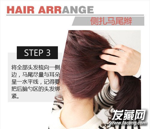 STEP 3:将全部头发梳向一侧边,马尾尽量与耳朵呈一水平线,记得要把后脑勺区的头发绑紧。