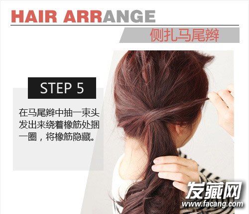 STEP 5:在马尾辫中抽一束头发出来绕着橡筋处捆一圈,将橡筋隐藏。