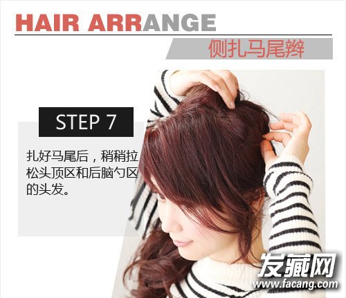 STEP 7:扎好马尾后,稍稍拉松头顶区和后脑勺区的头发。