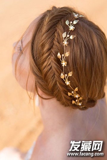 ,鱼骨辫加上花环配饰,让盘发更出众。