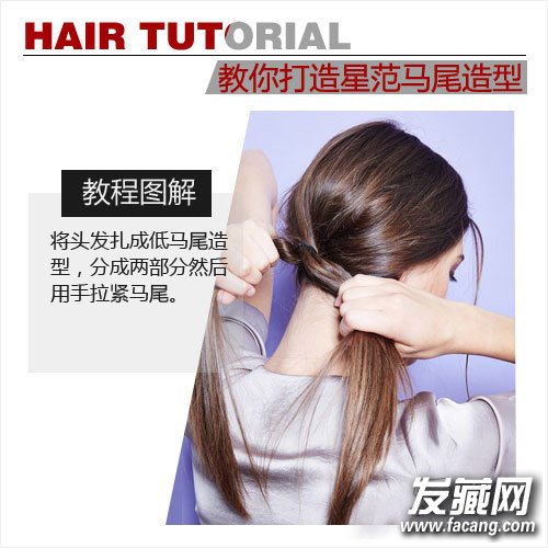 step 2:将头发扎成低马尾造型,分成两部分然后用手拉紧马尾