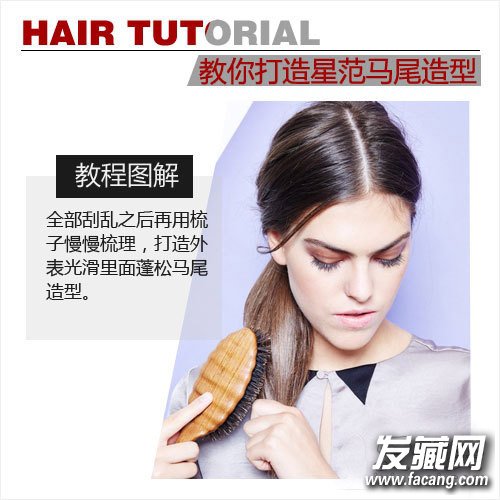 step 4:全部刮乱之后再用梳子慢慢梳理,打造外表光滑里面蓬松马尾造型。