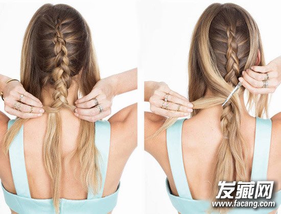 step 3:中间发束编成三股辫,采用3+2的编法进行编发,编至肩部左右,然后用橡皮筋固定。