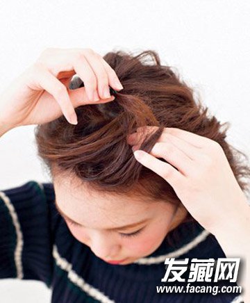 2,将编织好的发辫宛如打造蓬巴杜刘海般,蓬松地拧转1圈,用发夹加以固定。