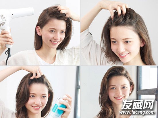 step 2:喷上发妆水用手抓出弧度,让头发往侧边走。