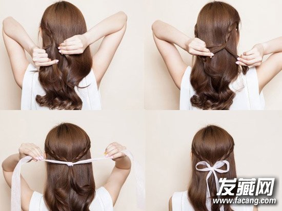 step 1:头发中分,之后在左侧取一小束头发,向后编成三股辫,固定好。
