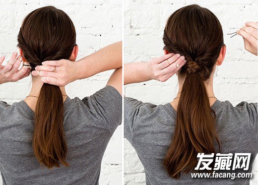 step1:用一个橡皮筋扎一个低马尾,然后取出一撮头发绕着橡皮筋打转,将皮筋隐藏起来,最后用发夹固定。