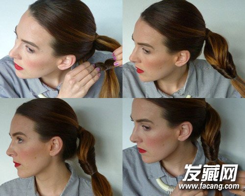 Step6:再次重复步骤五,用喷雾喷整个马尾,在所有马尾上碰上发雾以保证光滑和卷曲;