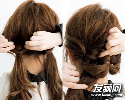 step1:将头发分成两个部分,并扎成两个松垮的辫子。让两个马尾各自马尾向上往中间向下内扣扭卷。