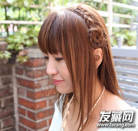 在刘海后侧选出一股头发,编成三股辫,并缠绕固定在耳朵上方,栗色发色更能增加皮肤光泽度,清纯唯美。