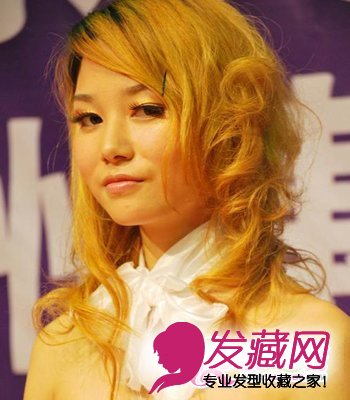 非常抢眼的金黄色陶瓷烫发型,大胆前卫,绝对是人群中的焦点哦!中长的头发烫出稍显凌乱的卷度却不失层次感,时尚感十足。斜刘海带出甜美与娇媚,同时修饰了脸型,减龄必搭。
