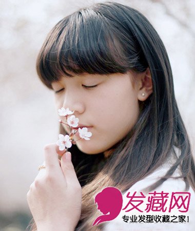韩式长直发发型,韩式齐刘海很好地修饰了女生的脸型,带出几分甜美,与紧贴脸颊的发丝打造超小脸效果。