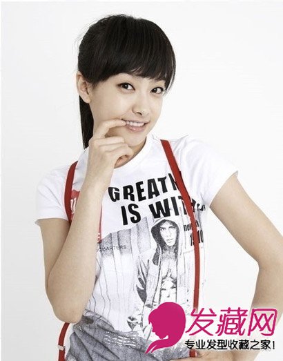 大片厚重的长刘海自然的修饰脸型,在黑色系发色的衬托下肤色更显白皙迷人,高耸的马尾露出可爱的小耳垂,俏皮可爱人见人爱。