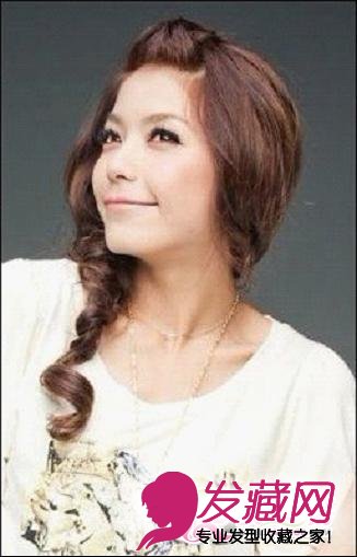 取前额适量的刘海扎出小发束,梳成小小花苞样,整体发型带着小清新的味道。半圆形的刘海修饰了圆润的轮廓线条,披肩的长卷发扭成一团侧梳,自然地搭在肩膀上,增加发型的俏皮感,很有浪漫小女人的韵味。(发型网编辑小萍)