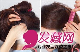 4 留出顶部发片,以后脑勺为中心,从两侧收拢发片,向内卷起并用发卡固定。在固定的时候要注意头后部的发量平衡以及发型轮廓。