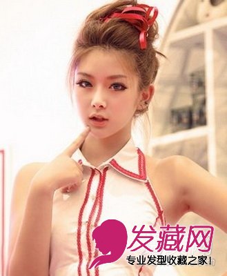 颜色的发丝,俏丽的气质,都将少女的盘发发型塑造出清纯的气息,随意的盘发形状,红色发带点缀其中,若隐若现的美丽。