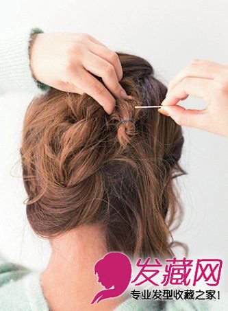 4、把左侧编好的发束向右侧的斜上方挪动,用发夹固定。