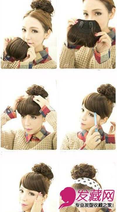 Step5:准备好刘海,一样是后面带有夹子的假刘海最好,夹住接近发包,然后用梳子梳好。然后那一条复古的发带,波点的很有复古的味道,然后绑住接洽处,那样会显得更加自然。