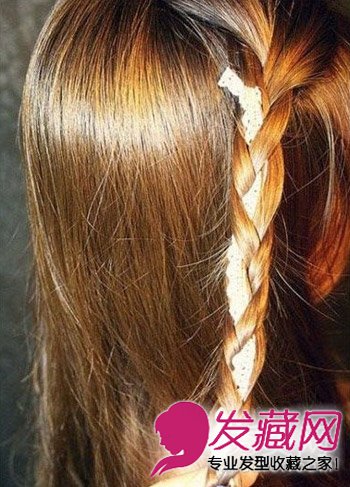 从右侧开始,在右上方挑出一束头发,加入发带混编成一股麻花辫子。