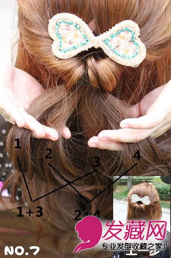 精巧亲切的鱼骨辫,将发束分开4小束,1束、2束、3束、4束,1、3束合为一束(1+3),2、4束合为一束(2+4)