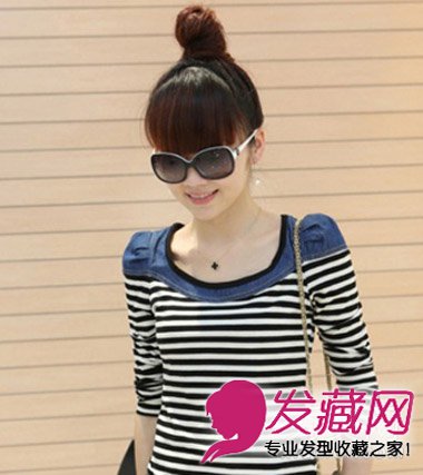 冲天的丸子头发型,厚厚的齐刘海配上墨镜十分帅气,是一款比较有时尚韵味的