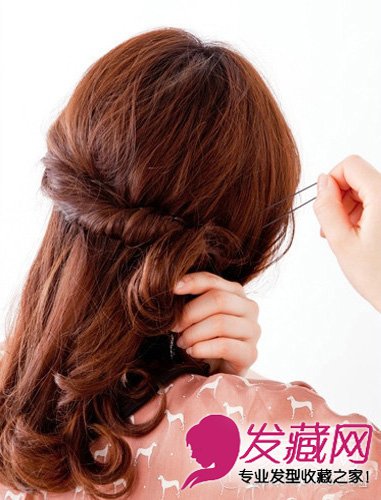 step2:扭转到右边耳朵后面时,如果头发较长的女生可能发尾没有完全收进,可以先用U型夹固定。