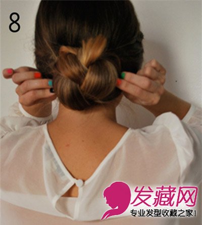STEP8 最后剩下的发尾用发夹固定在发髻内侧,如果发髻松动可用发夹固定好。