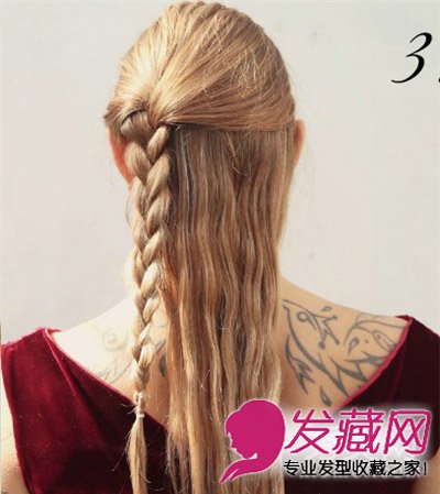 STEP 3 在STEP 2的基础上编至发尾,并用一根细橡皮筋在发尾处将编好的麻花辫固定好。这个步骤做出来的效果应如图所示偏左的半头麻花辫。