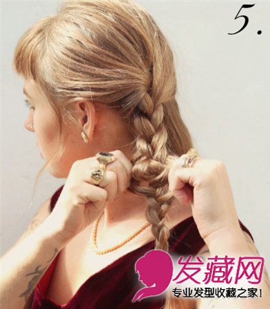 STEP 5 把上半部分头发编成的麻花辫拉至左边并把一开始就绑好的那股麻花辫用双手弄松散点,注意还要把麻花辫扯松点而不要扯乱。