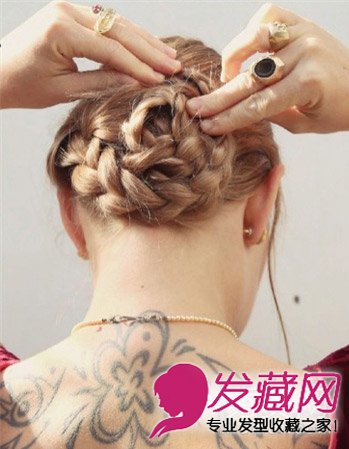 STEP 7 把上半部分头发编织成的麻花辫沿着STEP 6盘起的那条麻花辫的右边向上盘起,沿着已经盘好的那条麻花辫环着盘起。