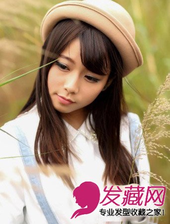 小清新的齐刘海中长直发,搭配上浅棕色的圆顶小帽子,文艺范十足,很可爱的女生装扮。
