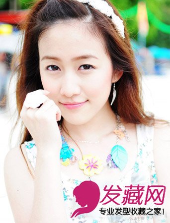 中分露额的造型,刘海向后扎起压在发箍下面显得清新爽朗,无遮掩的脸庞很好的凸显了mm五官的精致。