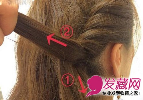 第一步:首先简单梳理一下头发,再如图示将右侧的头发分成两部分,扭转成发辫,同时要不断并入下方的头发;