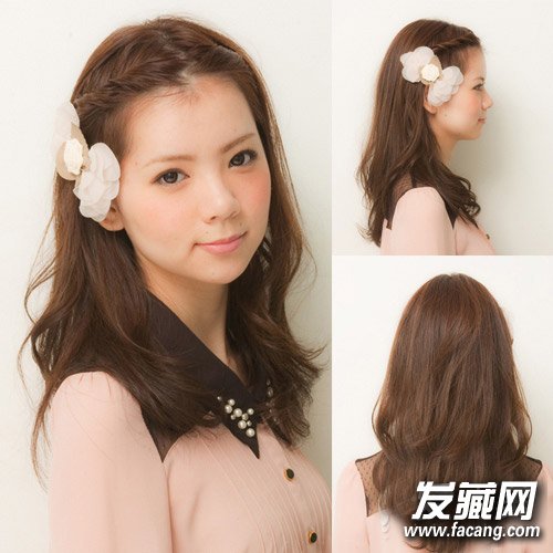 STYLE 10 刘海旋转至耳后,用花饰固定住,卷发轻盈的散落于肩上,迷人发型给浪漫约会加分。