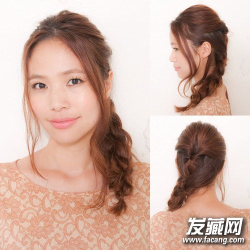 STYLE 2 发辫从头编到尾,将剩余的卷发连同发辫再扎成麻花辫。加上中分