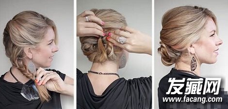 tip8、将麻花辫往上绕起,发尾塞进里面,用发夹固定好。