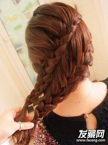 步骤6、直至编完为止,形成一条斜线,和上面那条麻花辫平行,编至发尾用橡皮筋扎好;