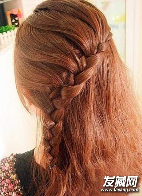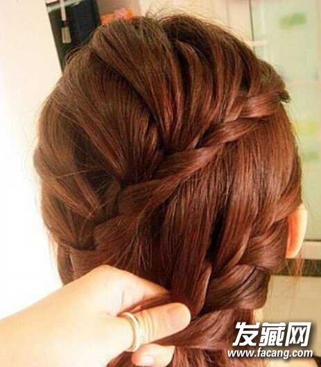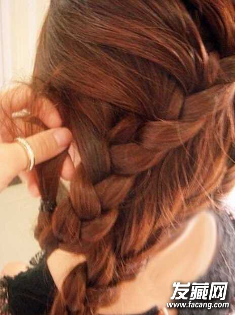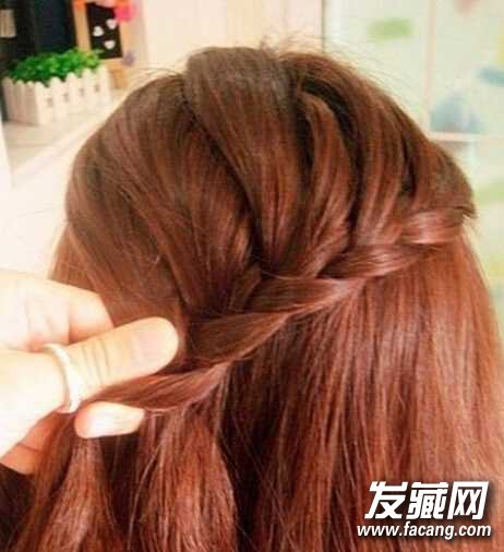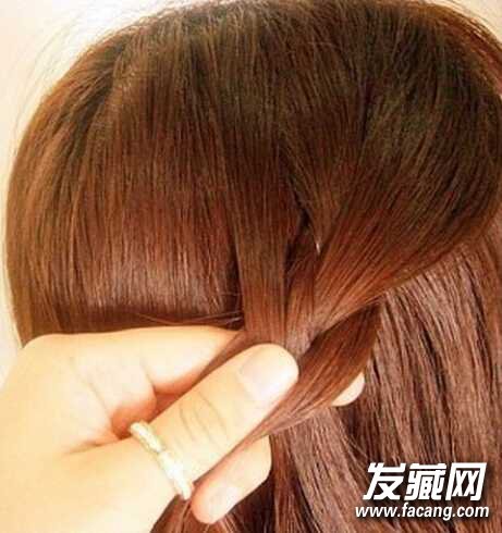 步骤3、麻花辫从一侧编至另一侧(图中是从右侧编至左侧),斜着编,编的时候要注意,编的过程中往里面新加入一股上面的头发,编一次就往里面加入一股;