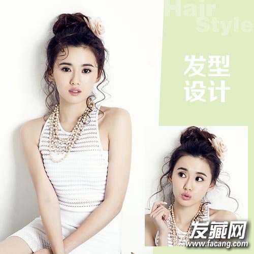 盘起搭配花朵发饰可爱甜美,少量的卷发发丝让造型有复古的气息,风吹起发丝时则清纯可爱。