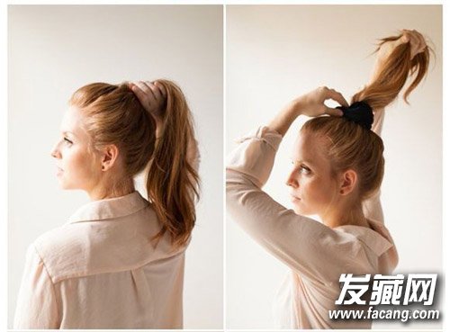 Step1:将所有头发高高梳起,先用一个皮筋固定,再套上一个盘发发圈。