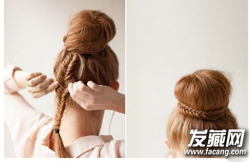 Step4:将之前编好的鱼骨辫适当地拉松一些,然后在盘发的尾部绕上一圈,若有多余,可以将发尾隐匿在内侧。这样一来,“小笼包”的褶子是不是更加明显了!