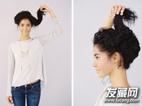 剩余的左耳侧的头发,按逆时针方向往头顶高高盘起。