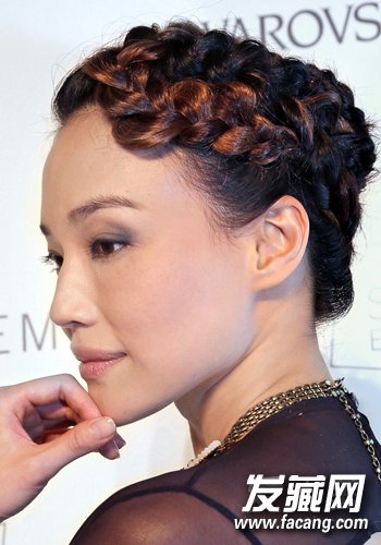 刘海是修饰脸型的一大法宝,但是厚重的刘海发量让人有种闷热的感觉,特别夏季尤其严重。像舒淇这样把长长的刘海编起来,既清爽又会散发出女人味。可以根据个人喜好,先把发顶的头发分成三七偏分,将侧分的刘海从一侧向另一侧开始编发。编至另一侧之后,将编发在耳朵的1/2处开始收紧。然后在耳朵下方位置固定。利用麻花辫子的立体感来增加装饰点缀。露出光洁的额头,让脸型看起来更完美。
