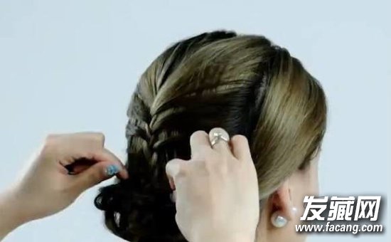 step 7:最后用手将鱼骨辫稍微向下拉,让盘发更加的自然有气质。