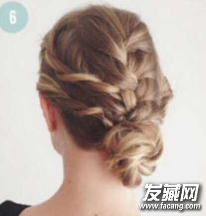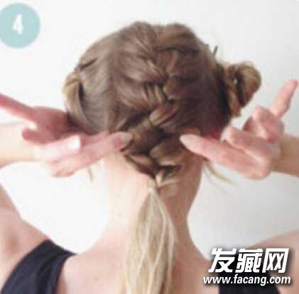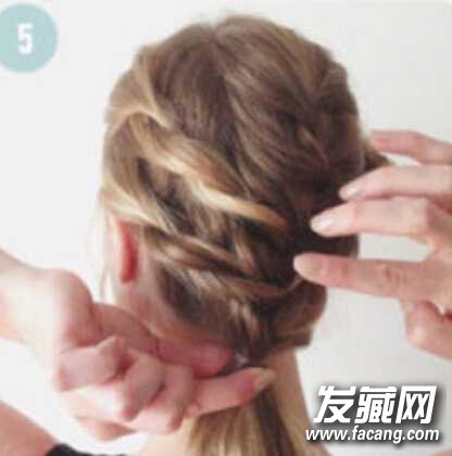 step4、将中间一份头发分为三股,编成麻花辫,在颈部位置用橡皮筋扎好,然后稍微将麻花辫拉出蓬松状,这样出来的效果会更好看;