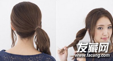【秋季简单盘发step02】紧接着将整条马尾分成两部分,然后扭转在一起,手法上可以稍微蓬松一些喔(如图)