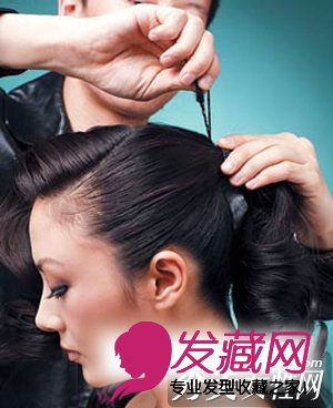 用橡皮筋和小小的黑色发夹将后面的发束在头顶和耳朵十字交叉的位置固定住,并留出空心的花样。
